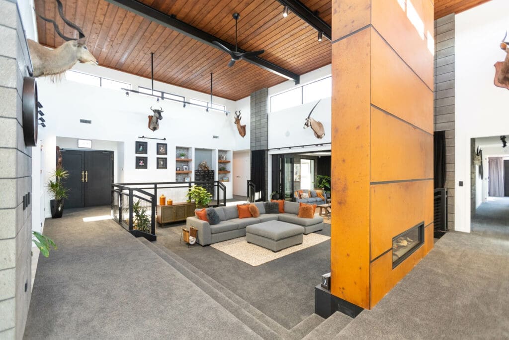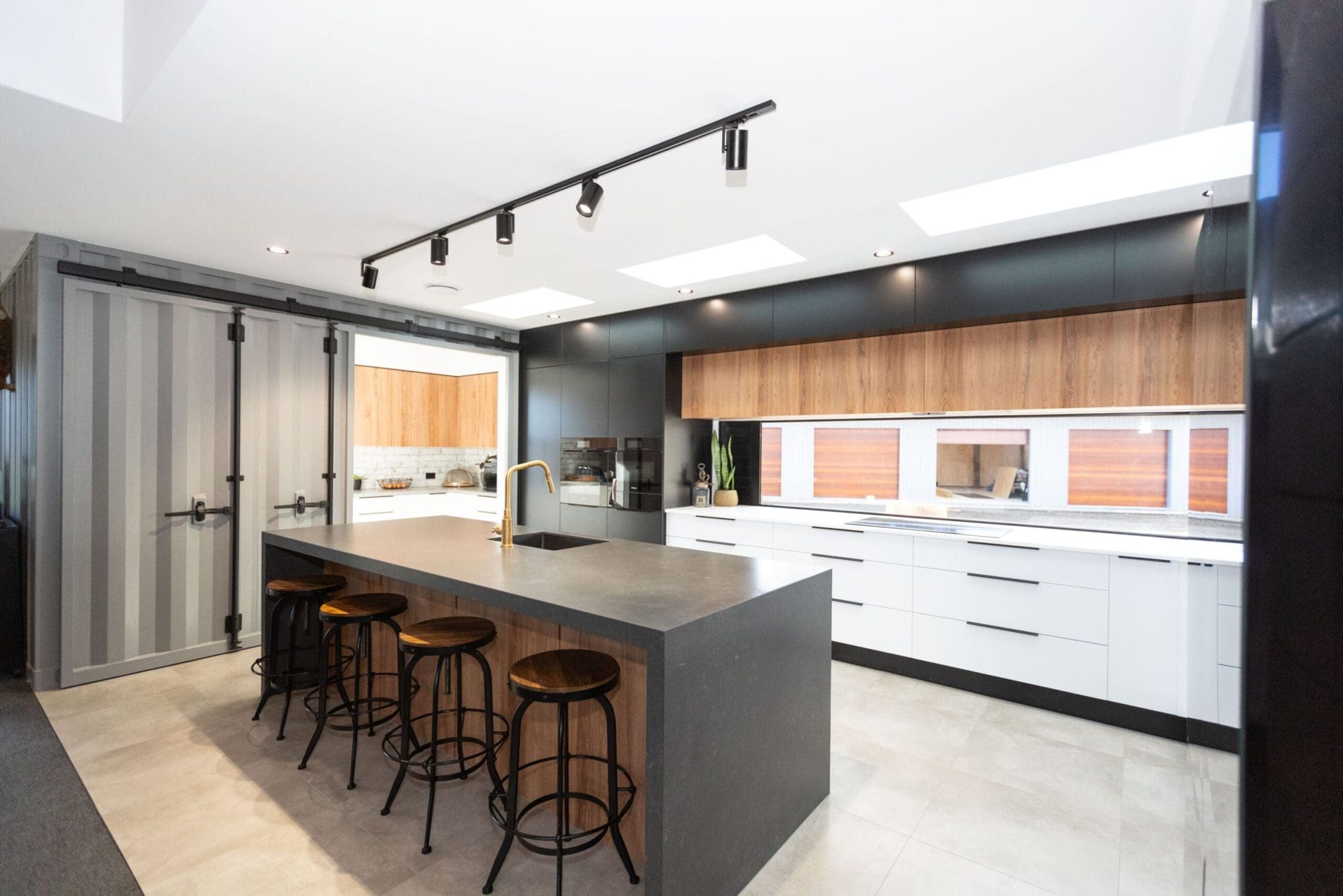 Kym’s attention to detail ensured her home would be unique. Living area ceilings are nearly six metres high. The sunken lounge includes a steel balustrade, and the pantry can be shut off from the kitchen with an enormous sliding door built to look like a shipping container. The movie room’s aluminium doors were custom-made. For the giant fireplace, Kym decided rather than use paint to make it look like rusted metal, she would create the real thing. “We laid out sheets of steel on homemade trestle tables and let the rain pour down on them.”