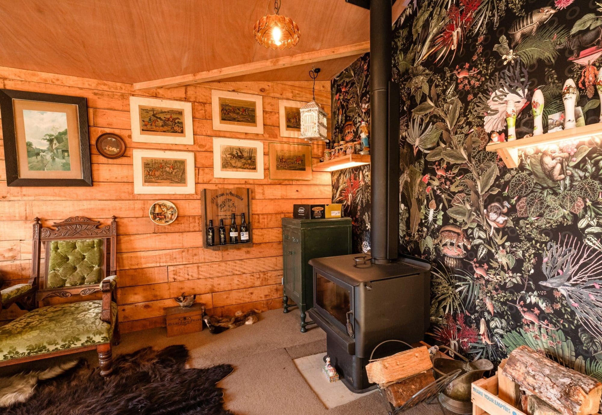 Brook worked closely with the owners to finetune the layout, which includes a lounge, bathroom, and kitchenette, all finished in ply and horizontal clad macrocarpa. Chandeliers, farming memorabilia, and retro fittings add style.