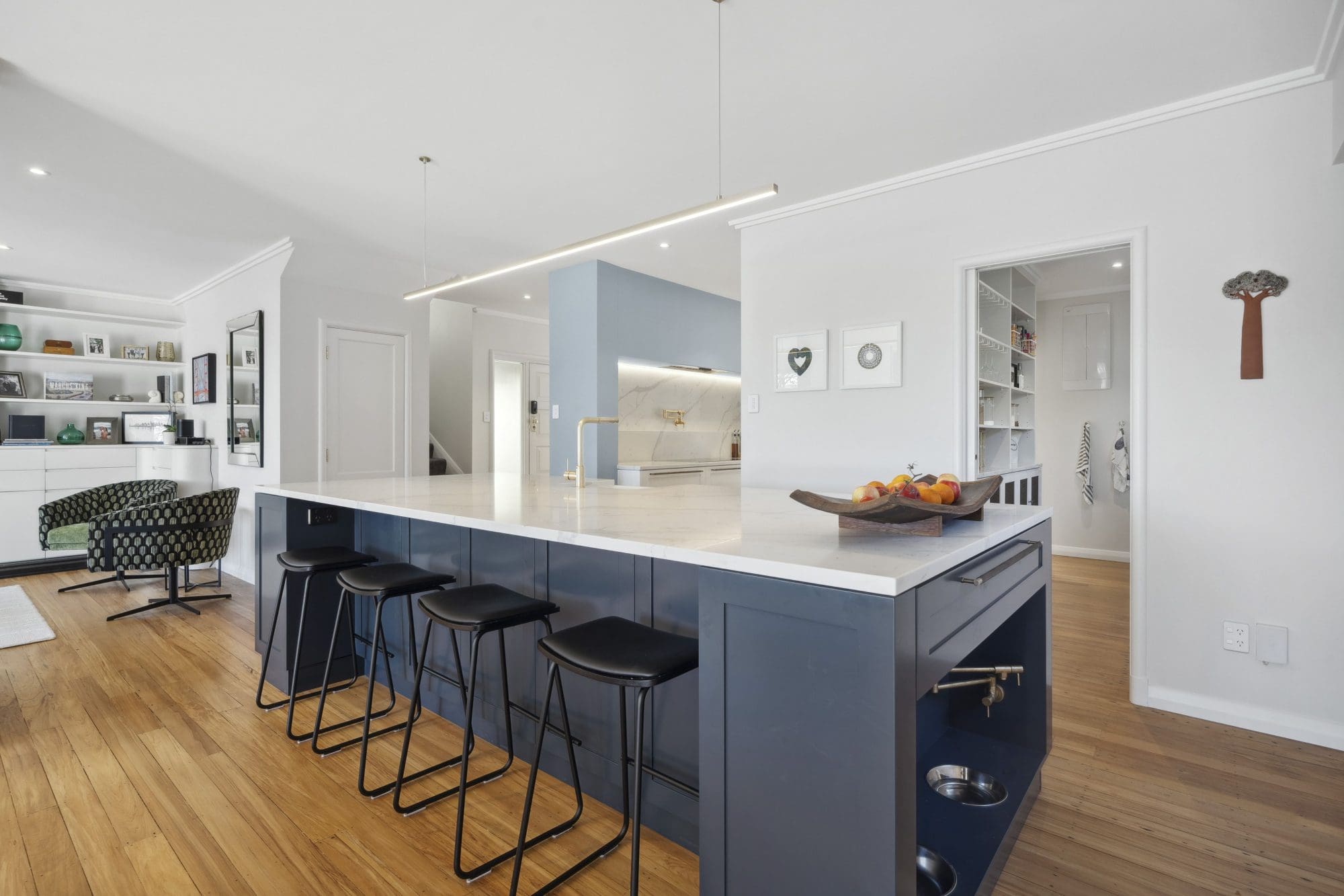 The timeless interior showcases special touches, including bespoke cedar sliding doors, copper mesh racking for wine storage, and custom dog bowls and pot filler recessed into the oversized engineered stone kitchen island. Four bi-fold timber doors connect to multilevel outside spaces with expansive decking and glass balustrades, revitalising the formerly underutilised backyard.