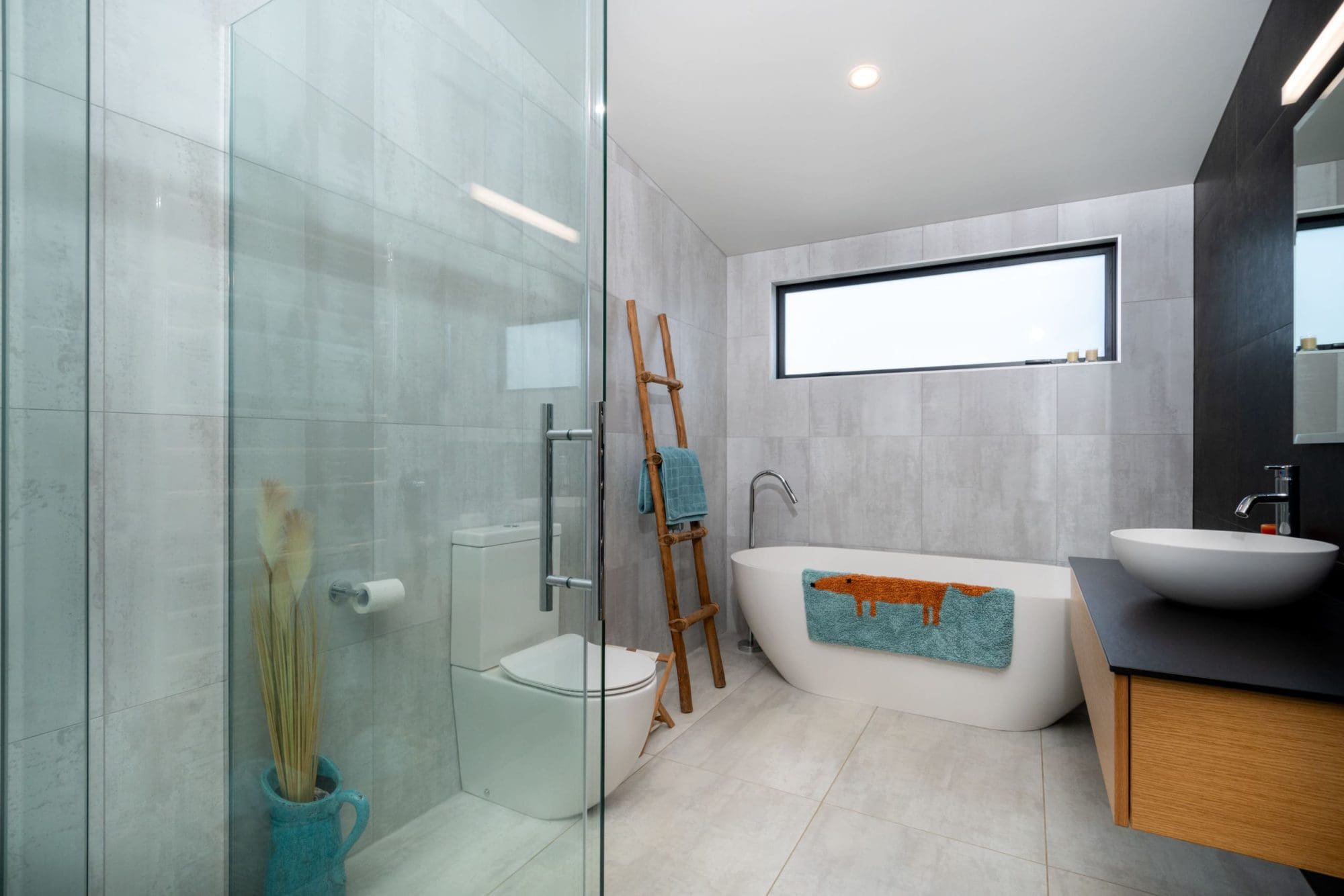 High ceilings provide a grand, spacious feel, while vertical cedar cladding wraps the home in the modern style designed by architect Keith Youngman. The generous kitchen features an engineered stone bench and a scullery.