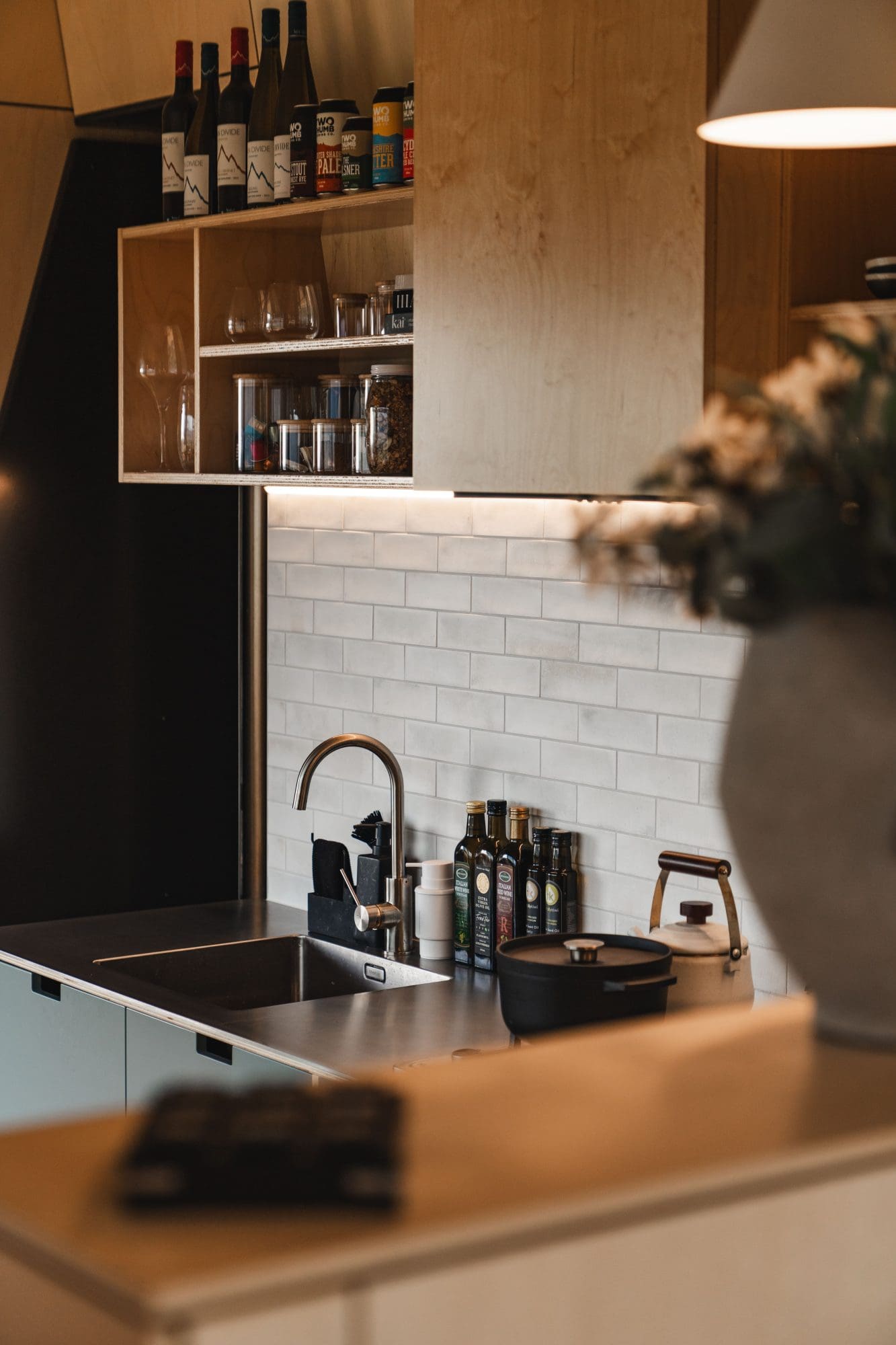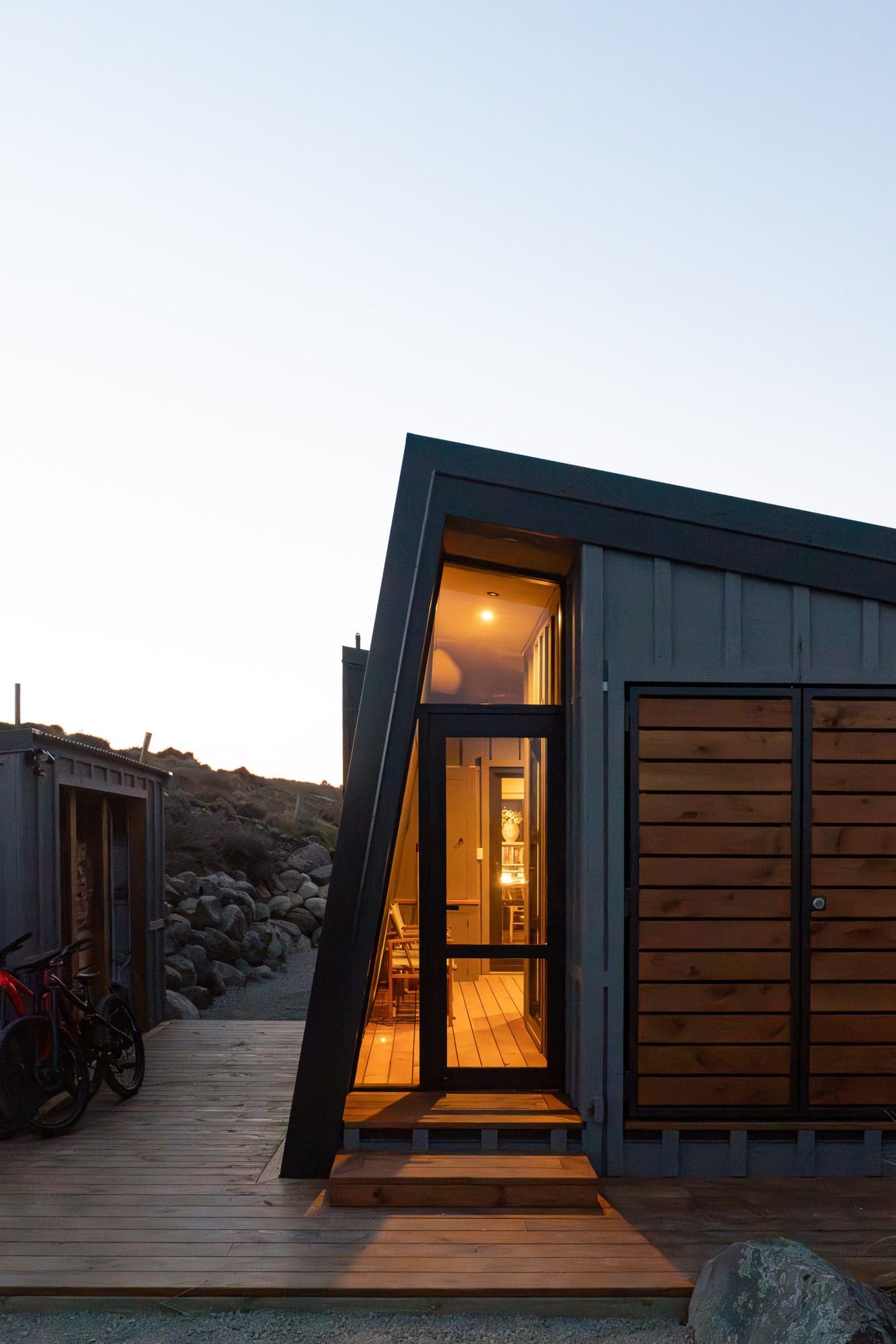 This sense of ownership shows – but not in a look-at-me way. Recessive against the hillside, the one-bedroom pod, clad in board-and-batten the colour of the greywacke mountains, has a warm heart. An innovative SIPs panel system that used a sandwiched panel of strandboard with a polystyrene core gives the shell good rigidity and thermal efficiency.