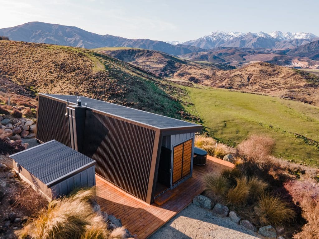 A back wall, designed on a 10-degree angle to evoke the feeling of sheltering beneath a rock overhang, was a challenge that involved measurements precise to the millimetre. Inside, poplar ply ceilings and wall linings feature a negative detail; the glazing frames vignettes of snow-dusted Mt Somers; and a wood-burner keeps Jack Frost at the door.