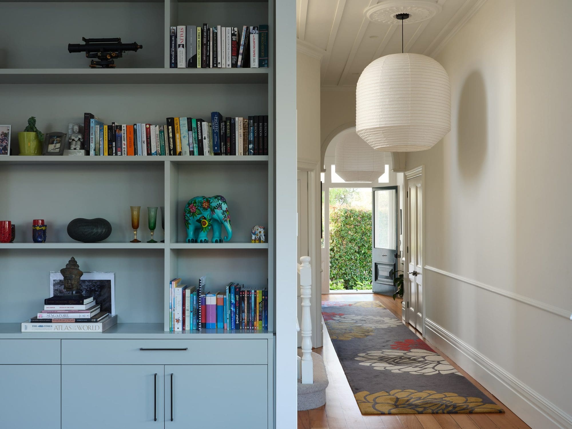 Preserving the home’s original features was a priority throughout the project. Stained glass windows, stairwell bannisters, ornate ceiling decorations, and original kauri flooring were meticulously restored. In contrast, the sleek black kitchen, with bespoke pressed powder-coated steel cabinetry, matching open shelving, and the oversized aluminium joinery and skylights in the living extension, offer a striking modern touch.