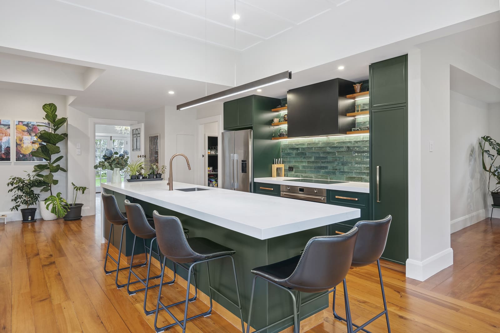 The new 35sqm kitchen, dining and living area is filled with light through banks of bi-fold sliders that connect to a deep deck, lawn and pool. Forest-green cabinetry and brass tapware are resplendent beneath a ceiling that has been pushed up to three metres above the island. “In the dining zone, we had to develop bulkheads to hide the structural steel required to support the roof and floor above,” says BJ. Flooring rescued from a house demolition in the same street integrates seamlessly.