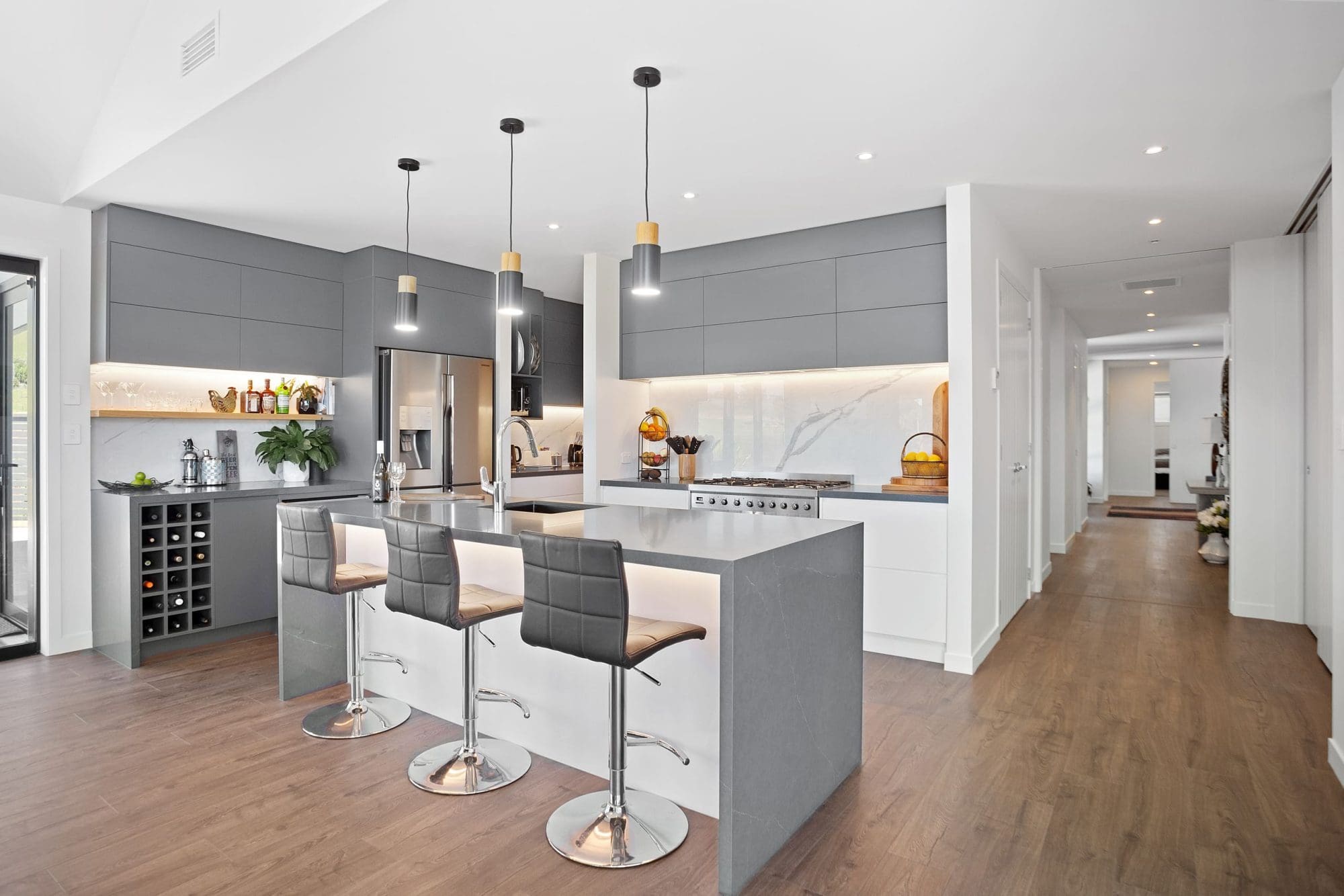 The result – a beach beauty with gravitas. Schist pillars flank the front entrance of the 320m2 home. Ceilings are nearly three metres high, and full-length cavity sliding doors create a flexible space, transforming one wing of the house into private guest accommodation. Extra-wide hallways and level thresholds, with no lips or steps, flow out onto the deck.