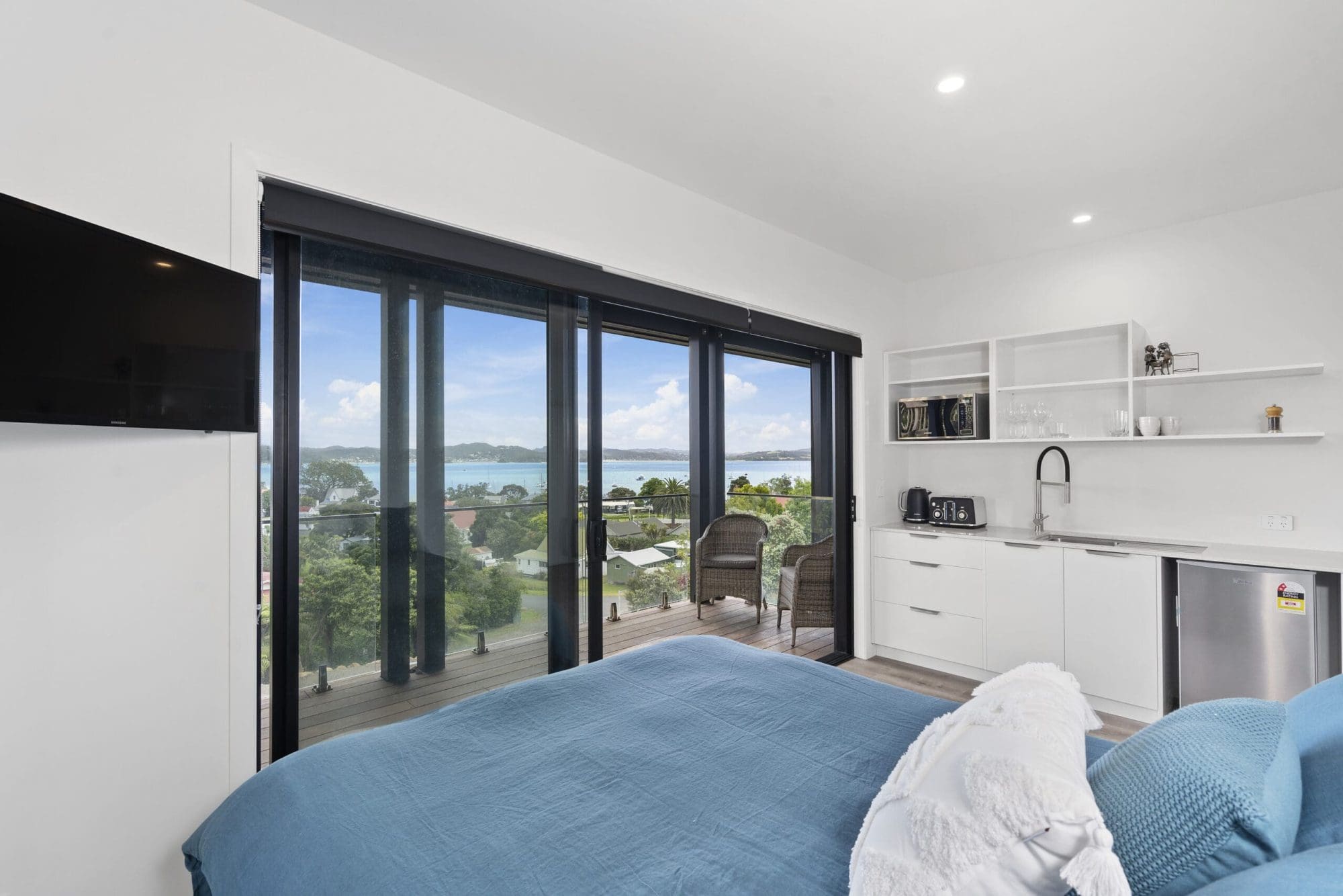 Steve Booth originally planned a classic, colonial-style for his new build in the heart of historic Russell. But he feared wooden railings would obstruct panoramas of the bay, so he ultimately chose glass balustrades and a modern design for the holiday house. “My vision was tackling the hill. I bought the land quite a few years ago and wanted to make sure the views were unimpeded.”