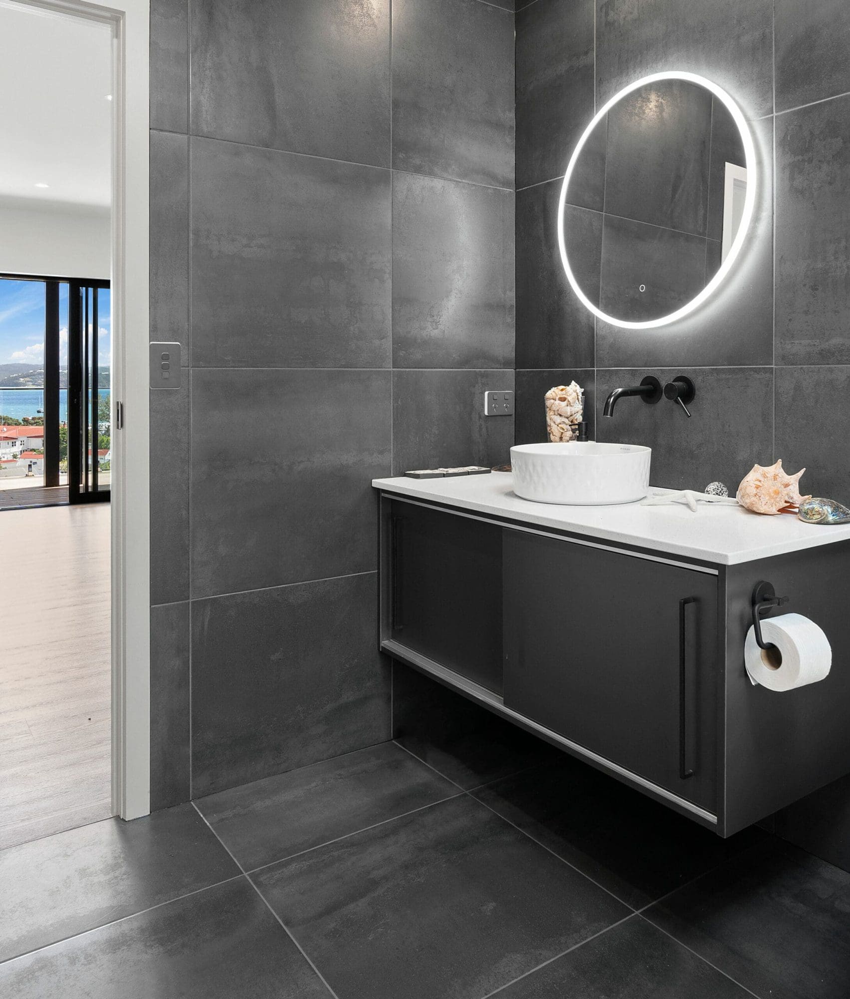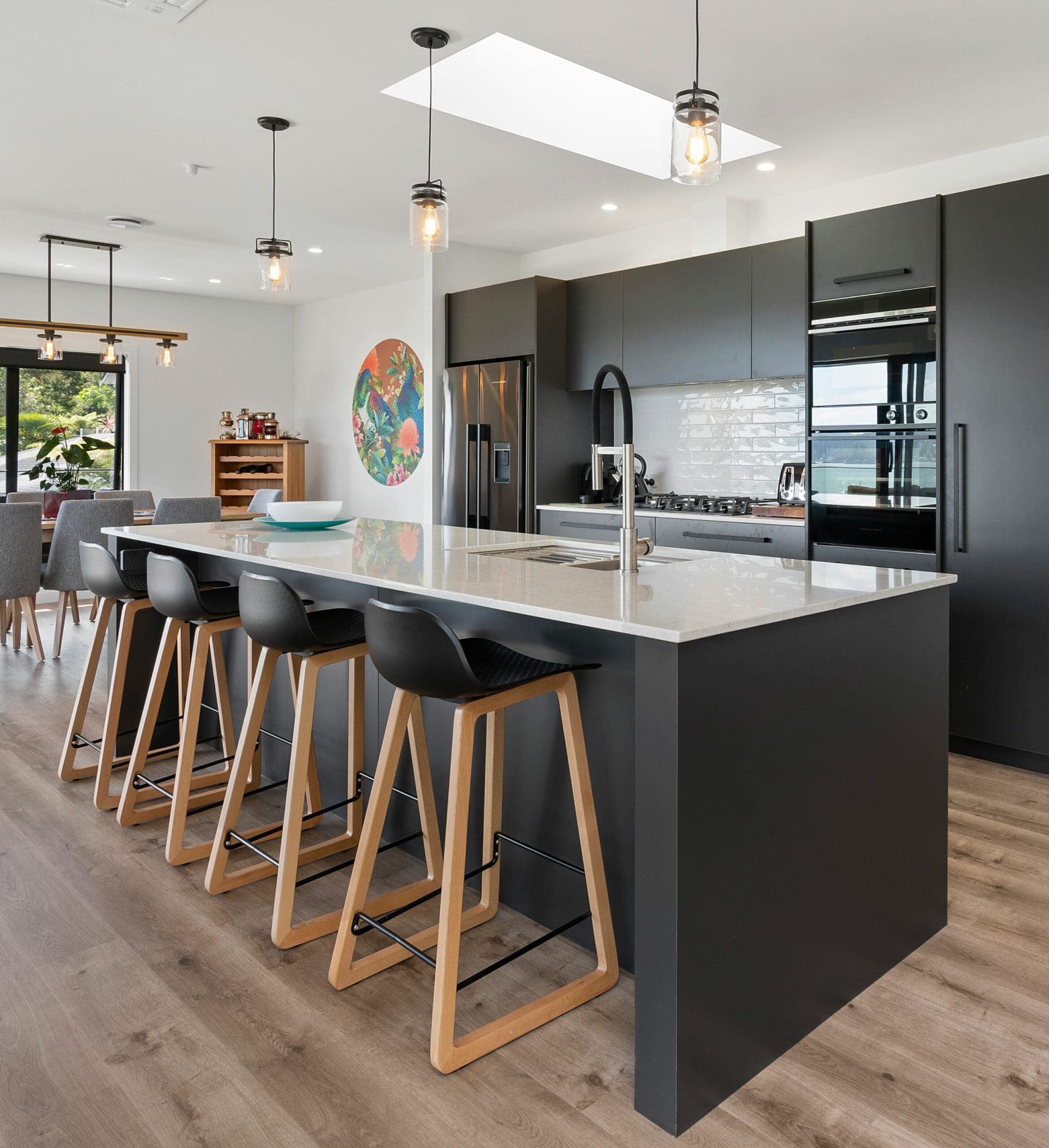 Matt and Steve added new elements throughout the build. A mezzanine and fourth bedroom were inserted above the high-stud garage, and generous kwila decking was included. Four skylights – placed in the kitchen, atrium, and each bathroom – allow the Bay of Island’s beautiful natural light to flood the home.