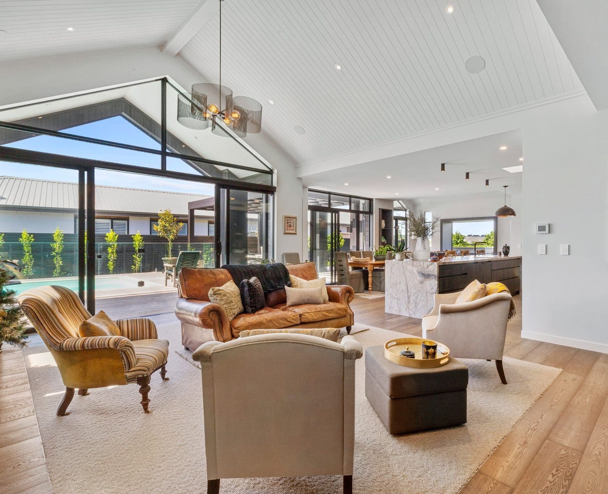 Multiple 3.6-metre-high raking ceilings in grooved ply required a complex collection of engineered steel and precise assembly. Flooded with light through floor-to-ceiling windows, the lounge, kitchen, and living areas open towards the outdoor dining pergola and beyond, where expansive kwila decking surrounds a central pool.