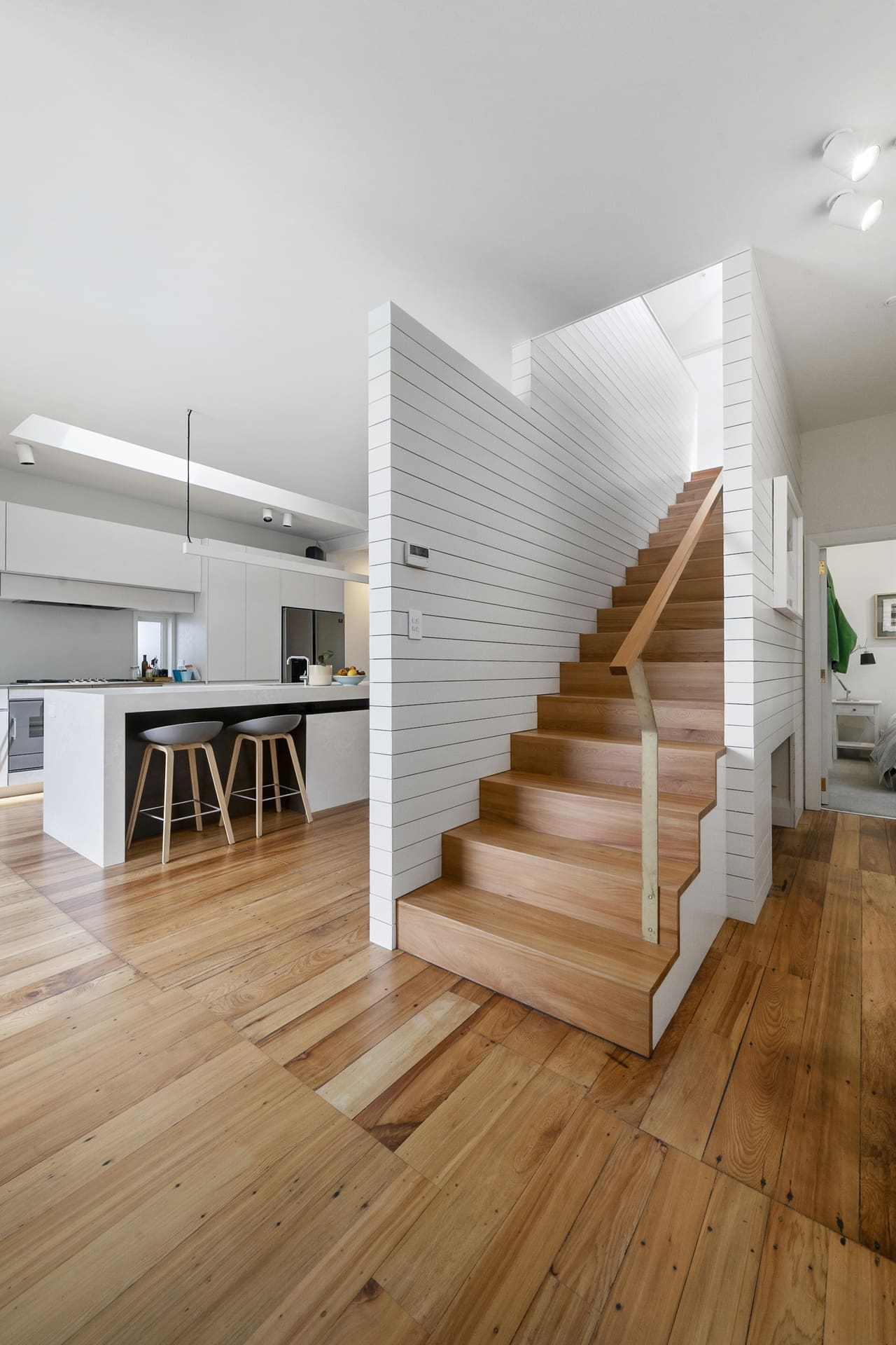 Adrian and his crew stripped the inside and installed stairs with a straight rise. Original matai timber floors remain, bestowing character and charm, while new, double-glazed windows add contemporary comfort and energy efficiency. The upper storey has been transformed into a large master bedroom with built-in wardrobe and en suite.