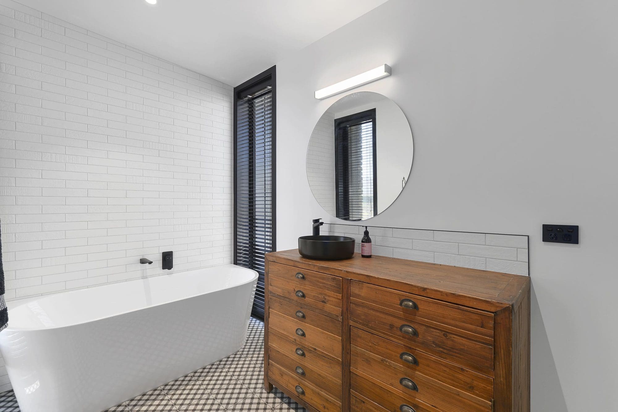 Architects Draftline of Timaru designed a bold, two-storey dwelling with a rock wall feature in front. Natural stacked schist forms part of the exterior walls. Inside, Sarah Bennett Interior Design used imagination and texture to make the home memorable. Large wall tiles in the kitchen are a stand-out feature and echo tiles on the fireplace. “We are really happy with the overall feel. The bathrooms took a lot of effort with tiling and designs,” says the owner. “Dan worked well with tilers and with Sarah, who picked the colours.”