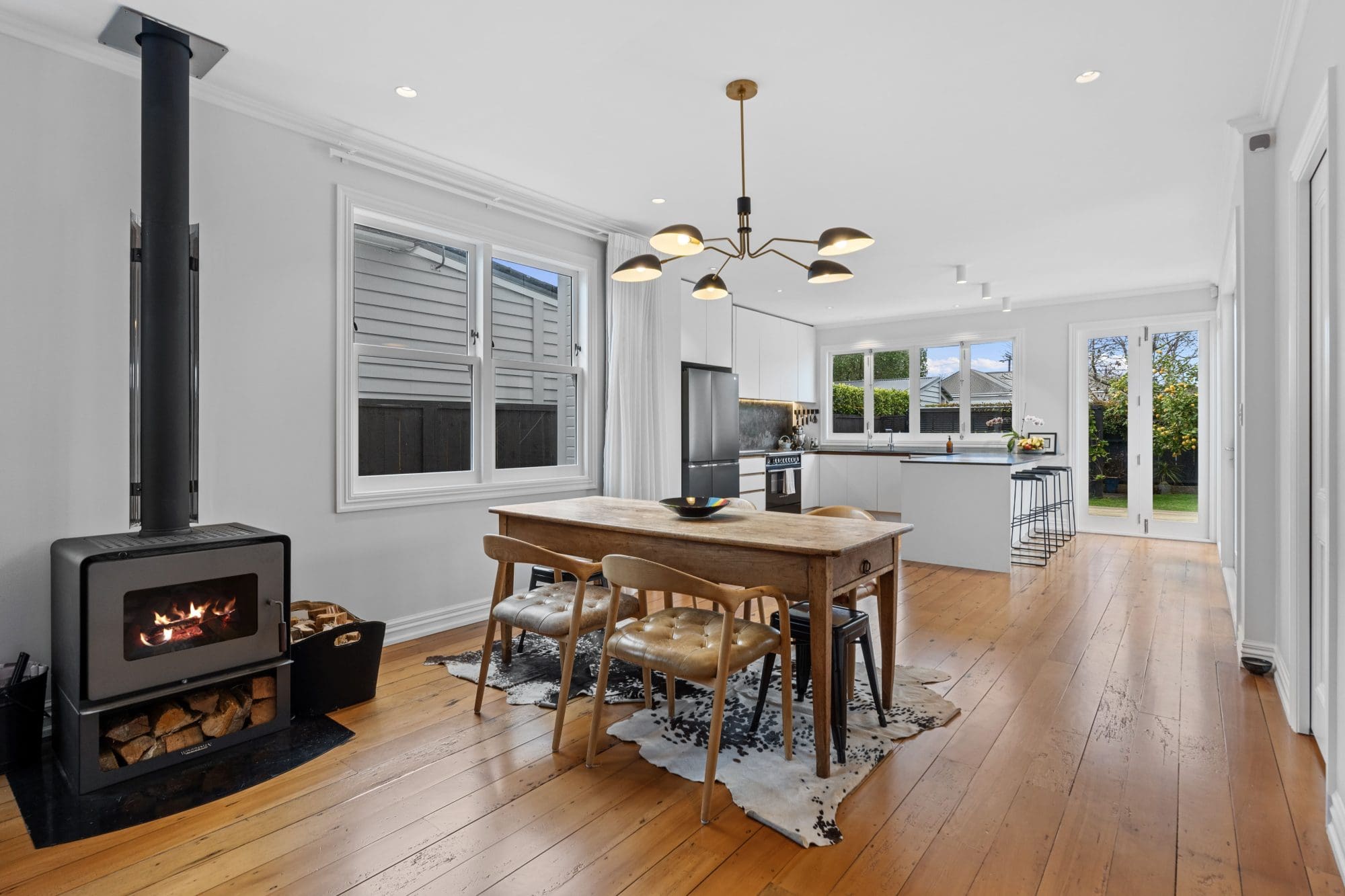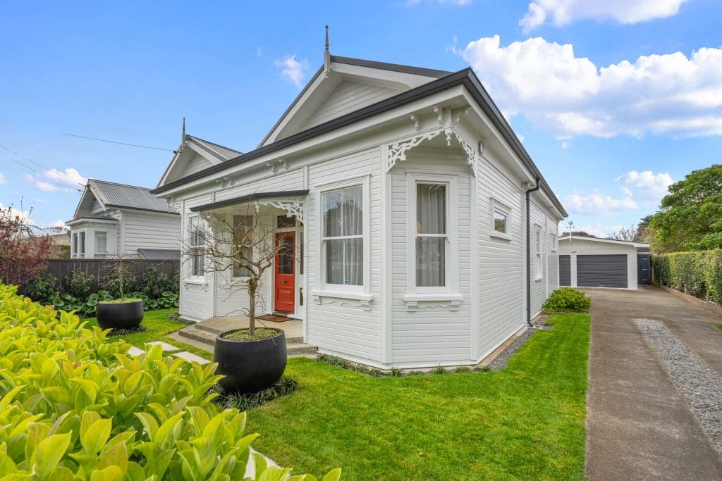 Back at ground level, the JRA team removed sections of the flooring to access the subfloor and set foundations for the new staircase and second storey. They sourced kauri boards from recycling yards to blend with the original flooring. Key period features were preserved or repurposed, including decorative mouldings, old kauri planks for recessed cupboard handles, and new leadlight windows with wooden sills matching the front door.
