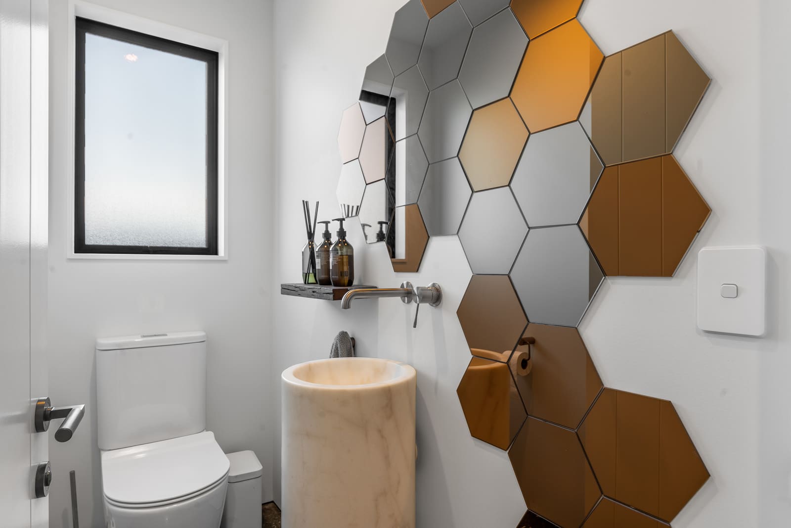 Playful details, such as brushed bronze Nero Opal tapware and a honeycomb mirror, lend personality in the ensuite, family bathroom and powder room. And there’s an intelligent toilet with, among other things, a warm seat, that makes paying a visit an experience.
