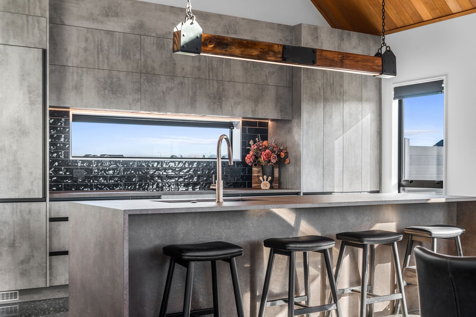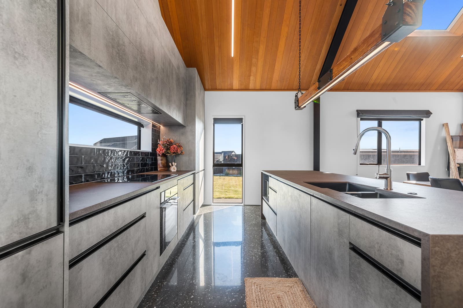 A pendant above the bench, complete with hardwood and black-iron fixings, picks up on the industrial theme of polished concrete-floors, which are heated to keep the chill at bay on a frosty mid-Canterbury morning when the mist is settling on the lake.