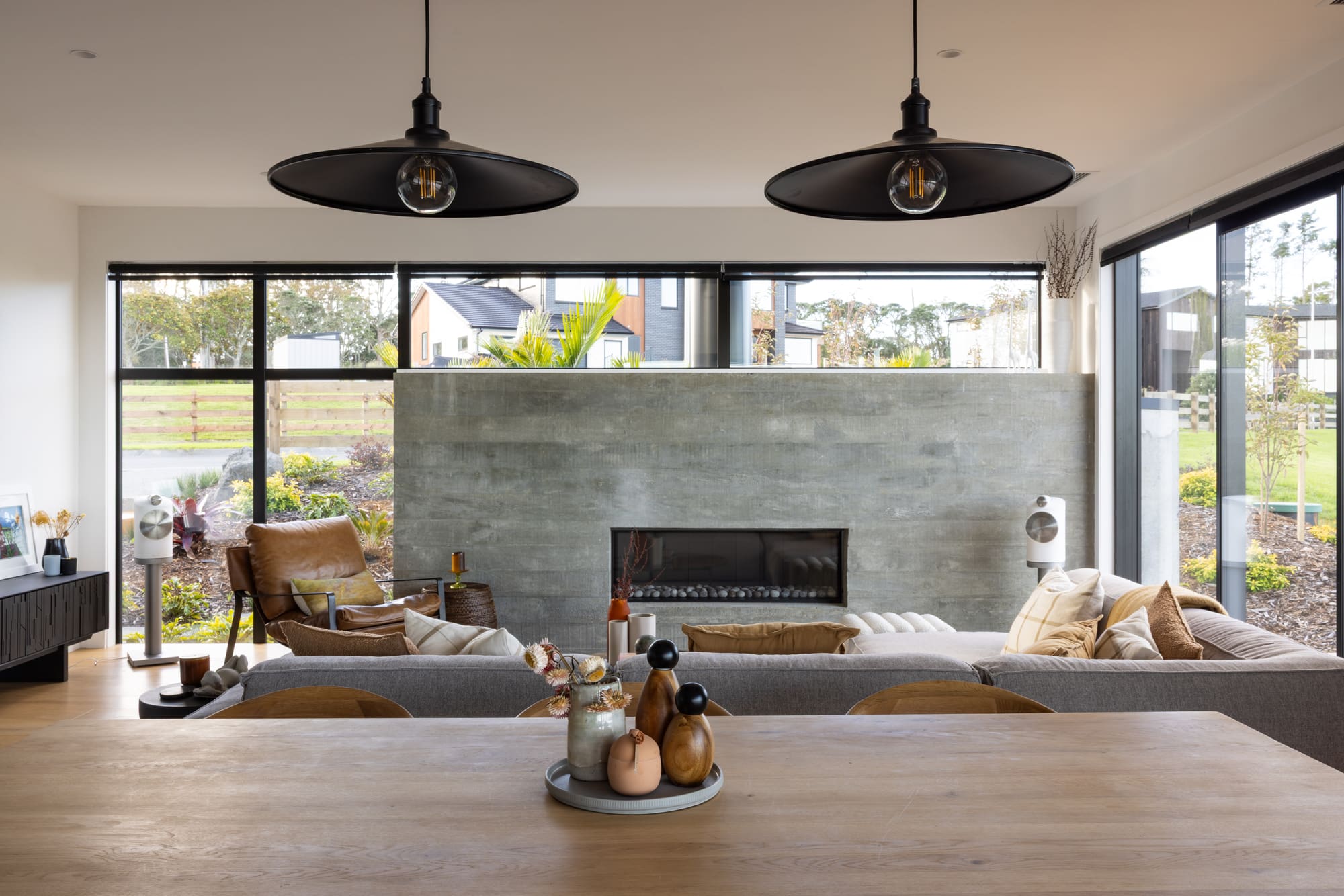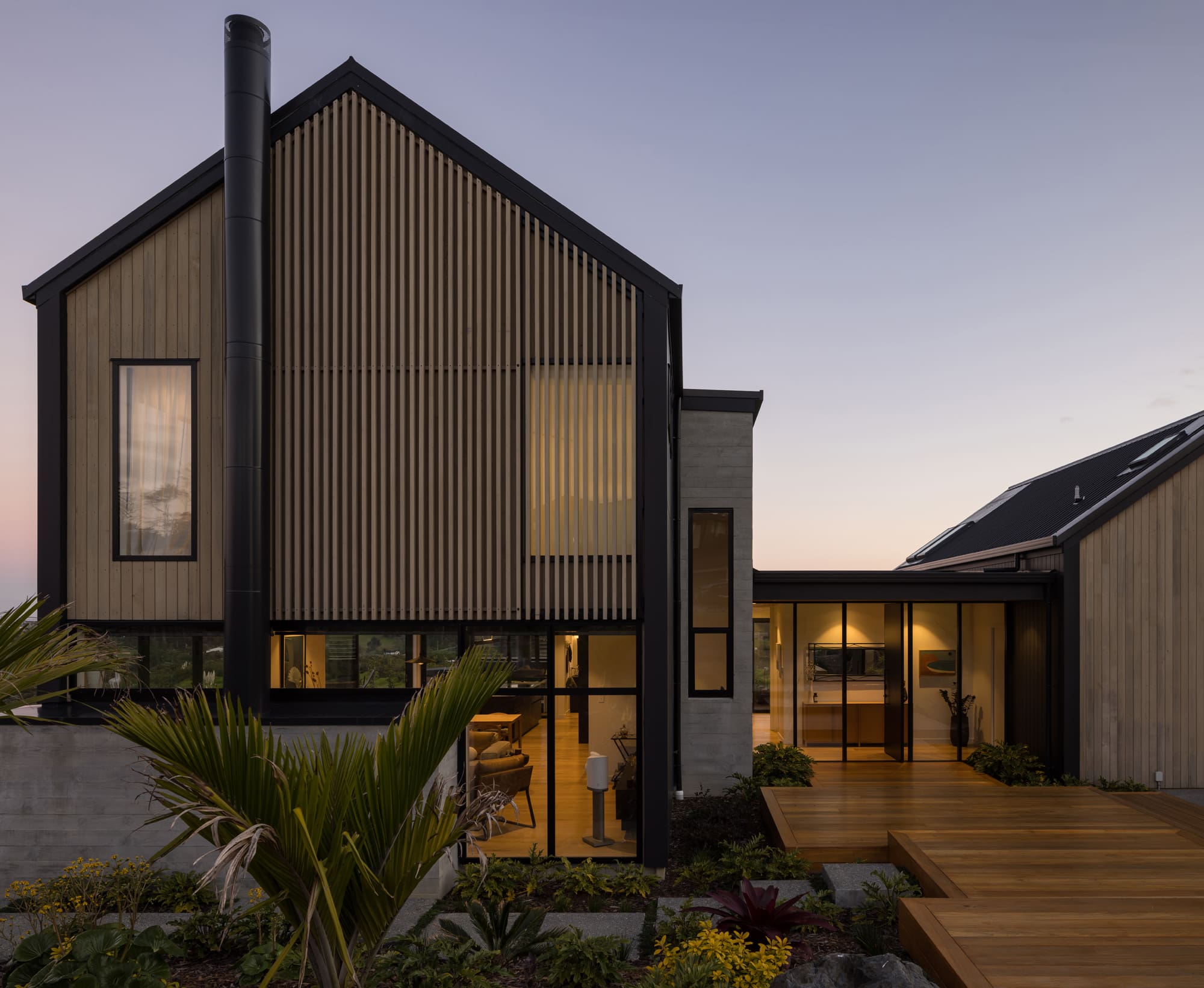 Today, two gabled pavilions – one tall, one small – are connected by a central entry link. The exterior mixes precast concrete with cedar, vertical shiplap and batten details. An outdoor living area with louvres is a sheltered space to sit and contemplate the view. Inside, the living zone is anchored by a mammoth concrete fireplace – robust against the lightness of floor-to-ceiling glazing. “We used a crane to lower its precast panels into place and then clad around it,” explains Mike.