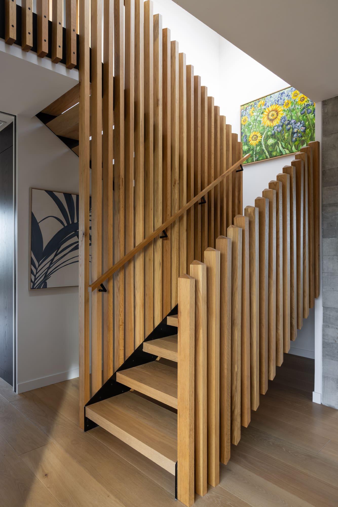 Wide-plank American oak floors channel the farmhouse, but Crittall-style doors sectioning off an office move the mood industrial. An open-tread stair with a hand-shaped balustrade is a sculptural ascent to the bedroom zone. “It was the first time we’d built anything like it and made several tweaks to get it to work,” says Mike.