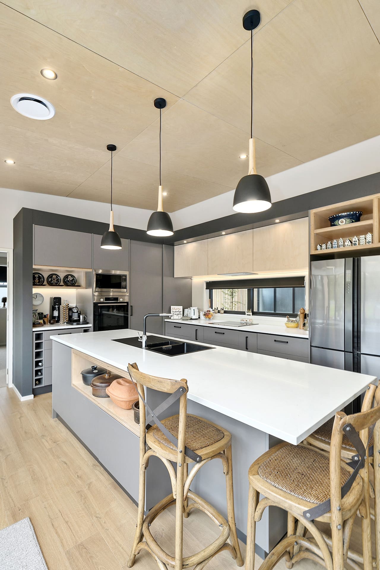 As for the interior, Anne’s love for timber hasn’t been left out in the cold. From the birch ceiling to the timber flooring, wooden touches are artfully scattered throughout. The concrete bench spanning an entire wall of the living room – Mike’s handiwork – is also a real hit. “It fits in with the design of the house so well,” Anne says. “I think Mike was quite proud of it!”