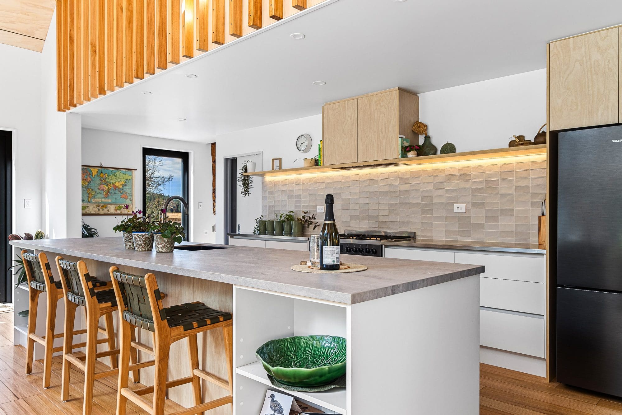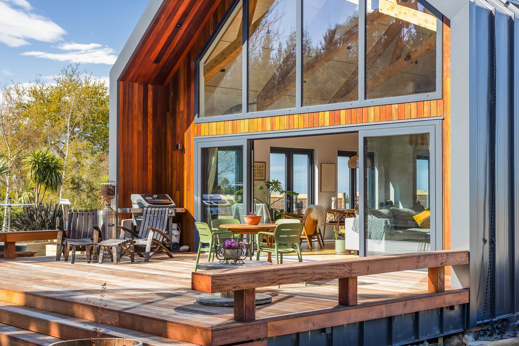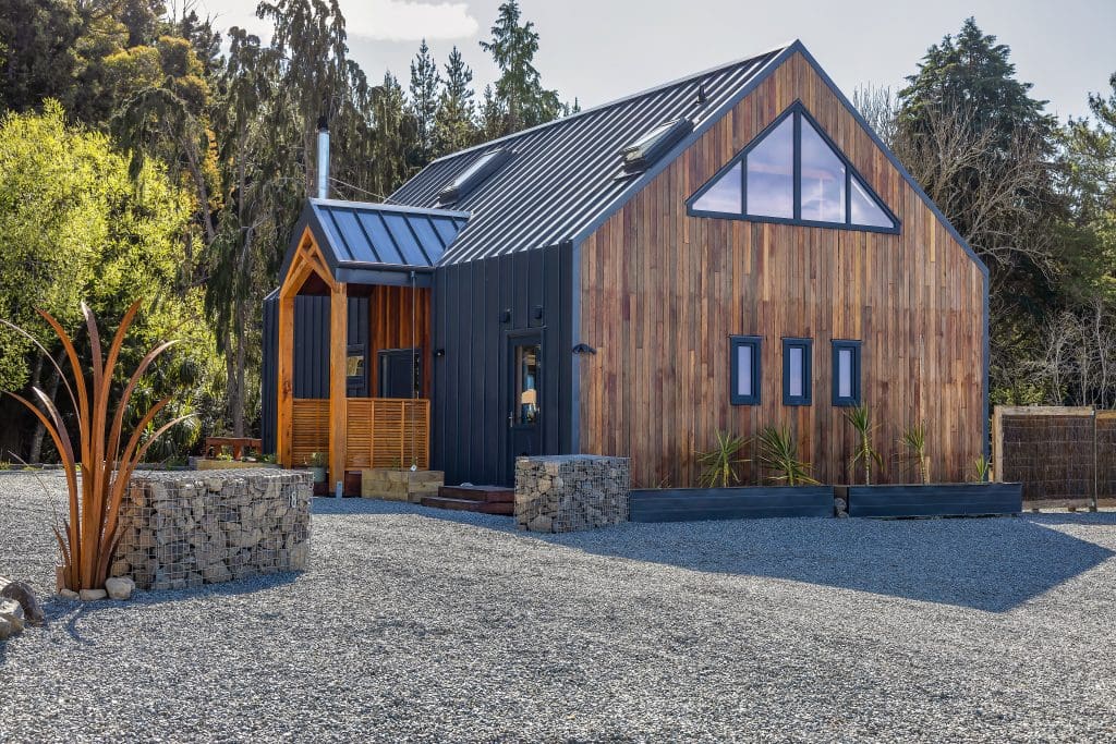 The home’s entrance, defined by a covered dormer porch and two solid macrocarpa beams supporting a feature cross-truss, sets the tone for the workmanship inside. The exterior cladding combines the durability of European tray profile steel, wrapping the home from the roof apex down to the earth, with the warmth of ironbark timber sourced from recycled wharf piles. Innovative details, such as chain downpipes and a shingle-lined concrete culvert replacing traditional guttering, effortlessly blend form and function.