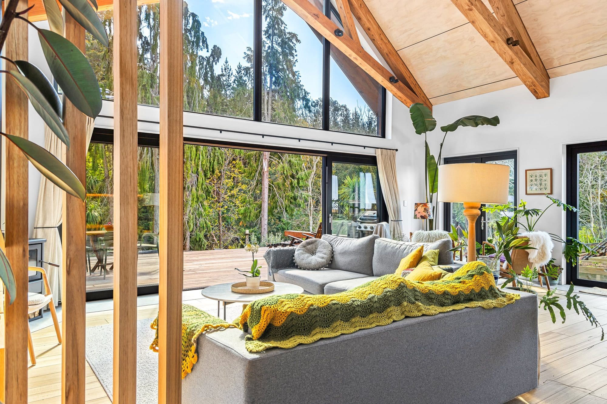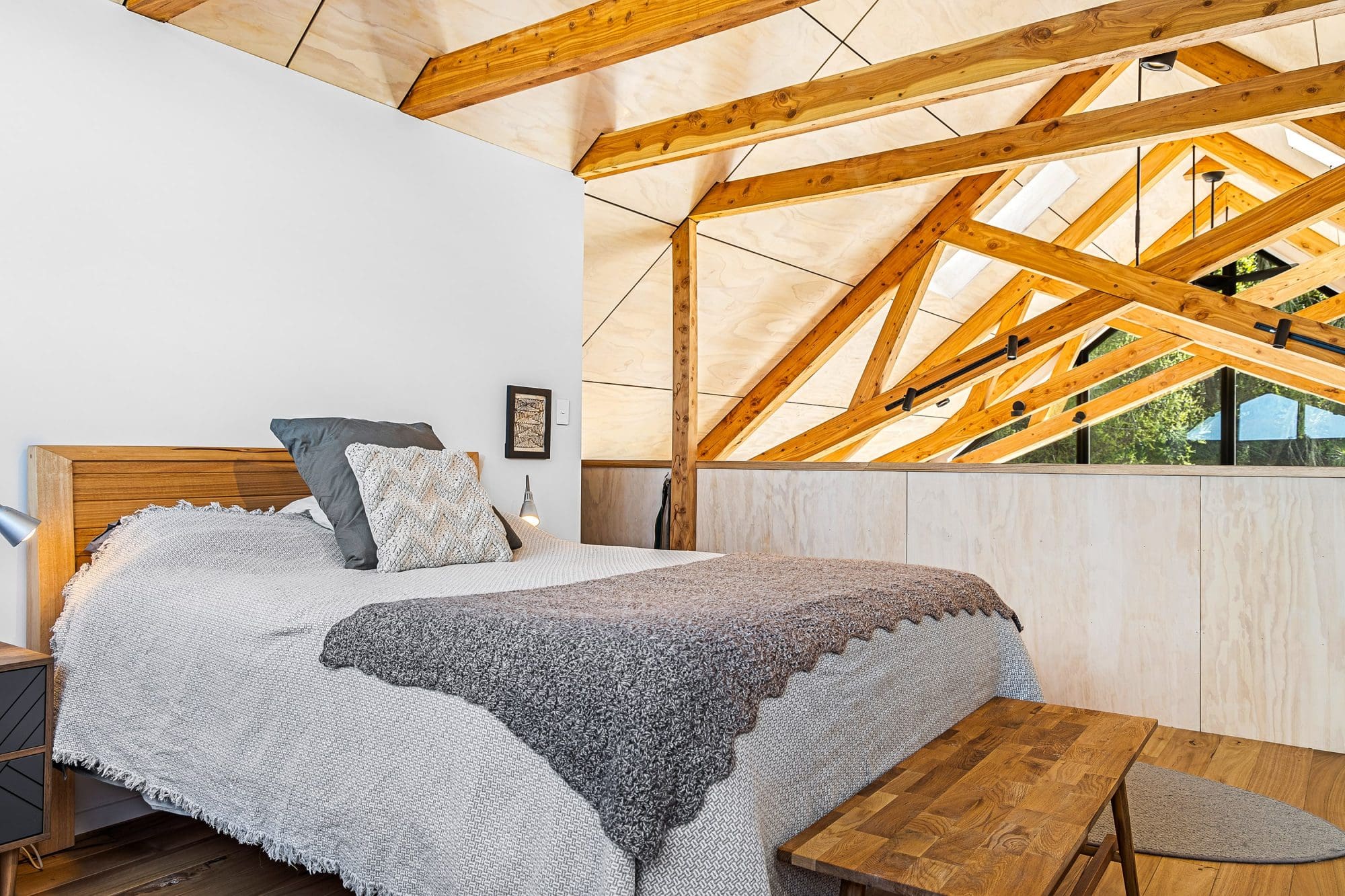 Inside, the timber theme continues, with eucalyptus flooring and solid timber handrails and balustrades. Large triangular windows, tracing the gabled roofline, frame forest views. Blonde birch ply ceilings provide a crisp contrast to the rich timber textures. The mezzanine level master suite, the only bedroom within the home, features false macrocarpa ceiling cords, adding intimacy without lowering the height. The gable windows here, offer glimpses of the ocean.